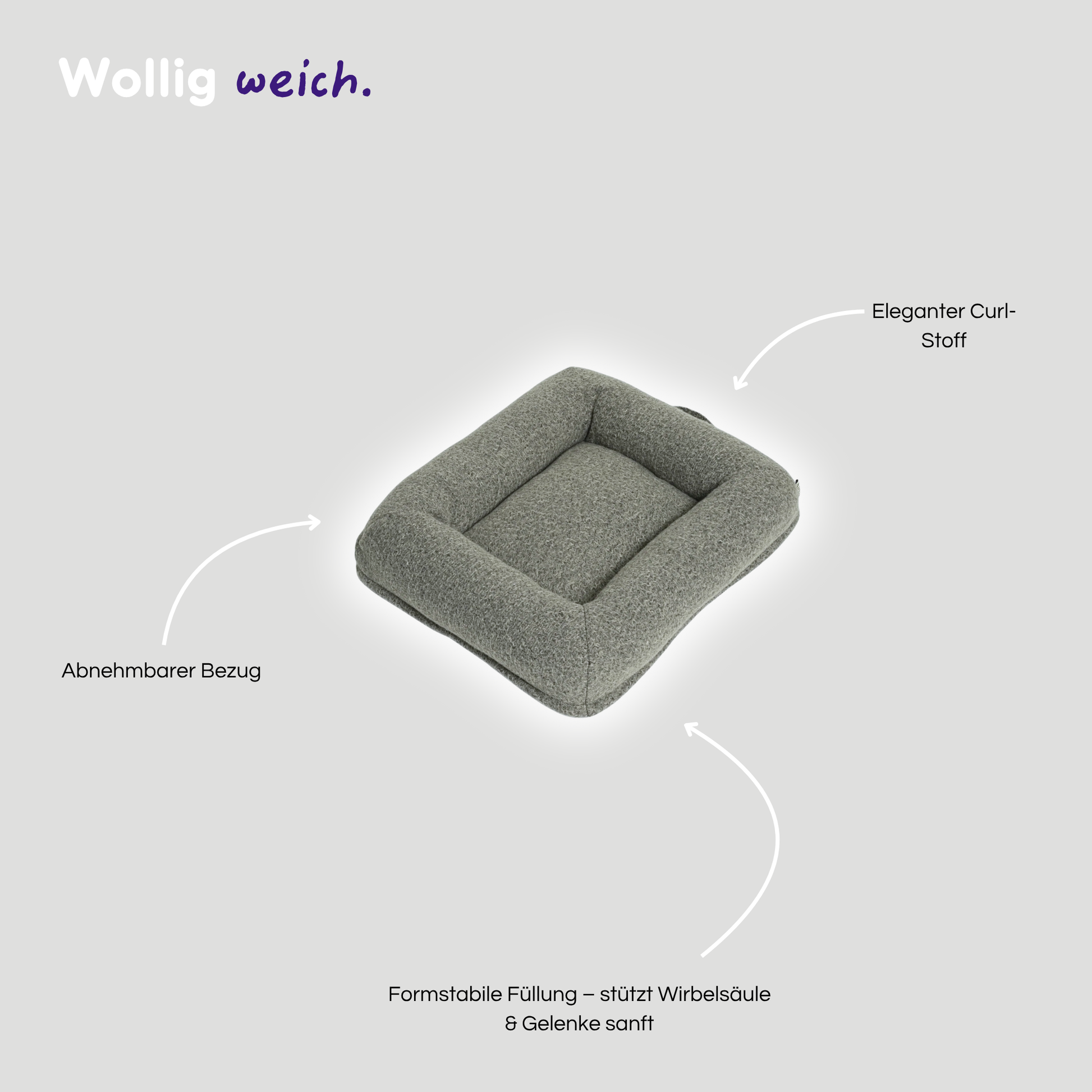 Das Curl Dog Bed in Taupe vereint stilvolles Design mit durchdachtem Komfort. Die rechteckige Form mit sanft gerundeten Ecken bietet Geborgenheit, die formstabile Füllung stützt Wirbelsäule & Gelenke. Ein Bett, das sich gut anfühlt – und auch gut aussieht.