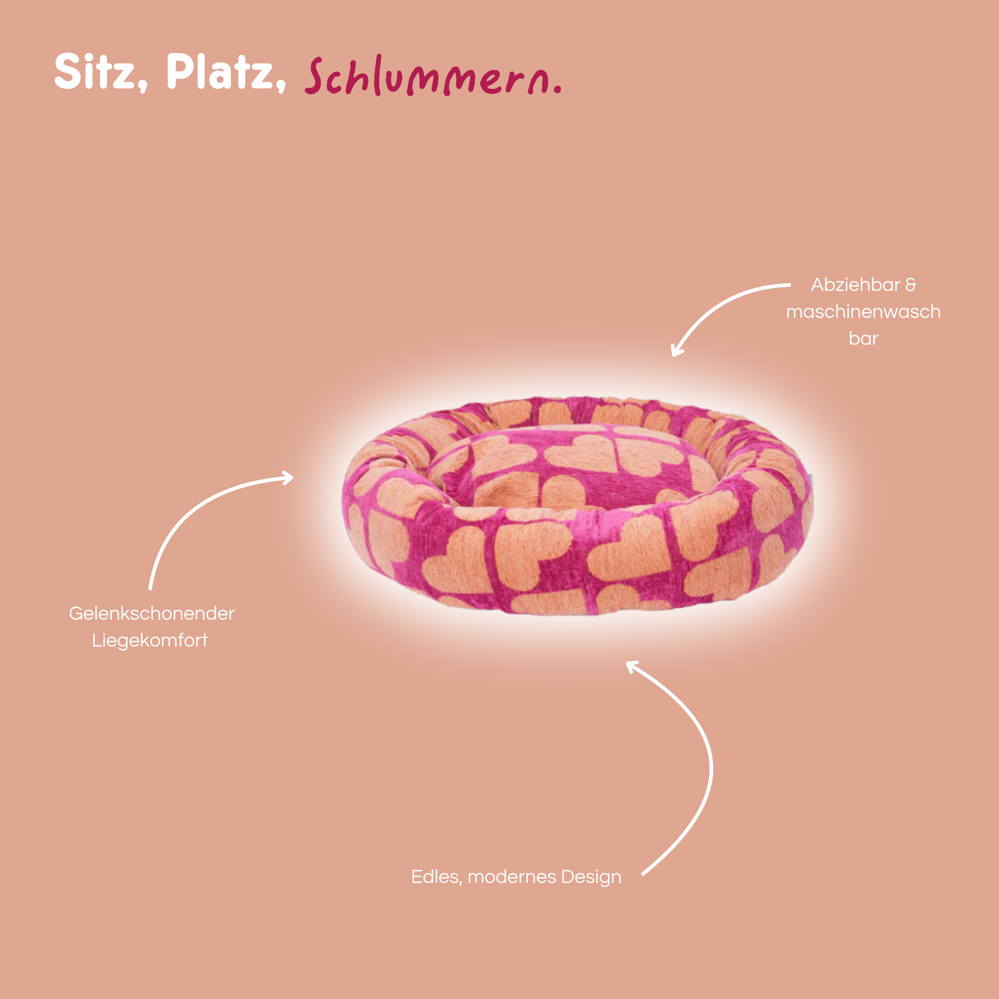 Das Heart Round Dog Bed vereint stilvolles Design mit orthopädischem Komfort. Die runde Herzform bietet Geborgenheit, Memory‑Foam‑Flakes & Silikonfasern stützen Wirbelsäule & Gelenke. Ein Bett, das sich gut anfühlt – und auch gut aussieht.