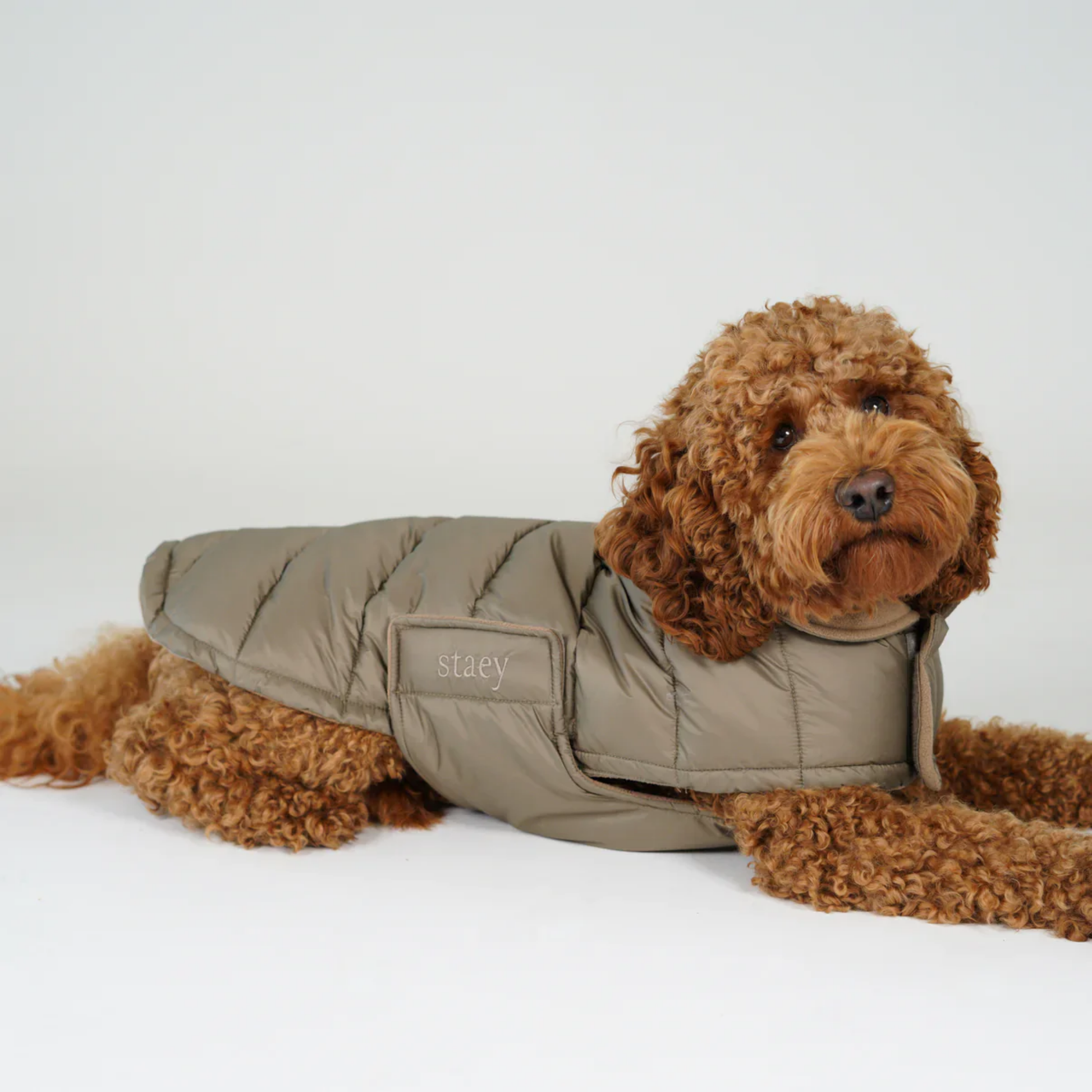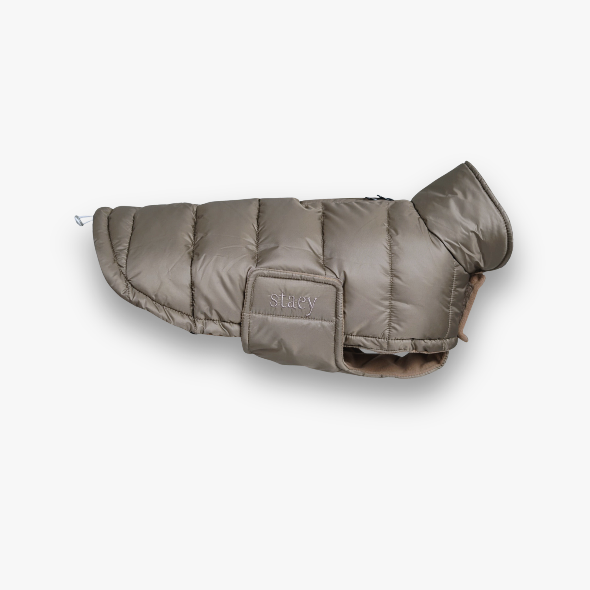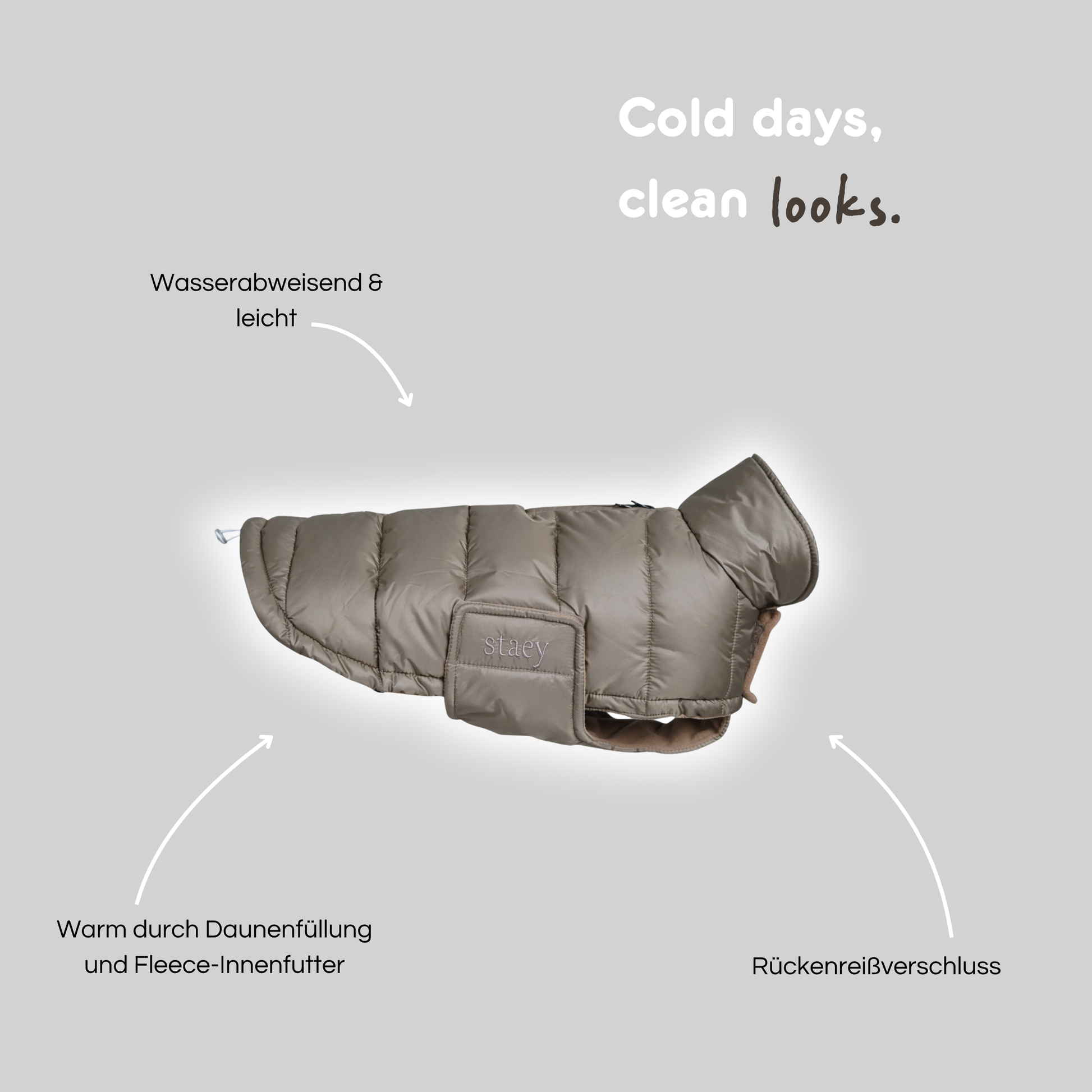 Der Nora Mantel von Staey vereint skandinavische Designsprache mit hochwertiger Funktion: Eine Innenlage aus Fleece und Daune sorgt für wohlige Wärme, der wasserabweisende Außenstoff macht ihn wetterfest. Ein Hundemantel, der Wärme schenkt und super aussieht.
