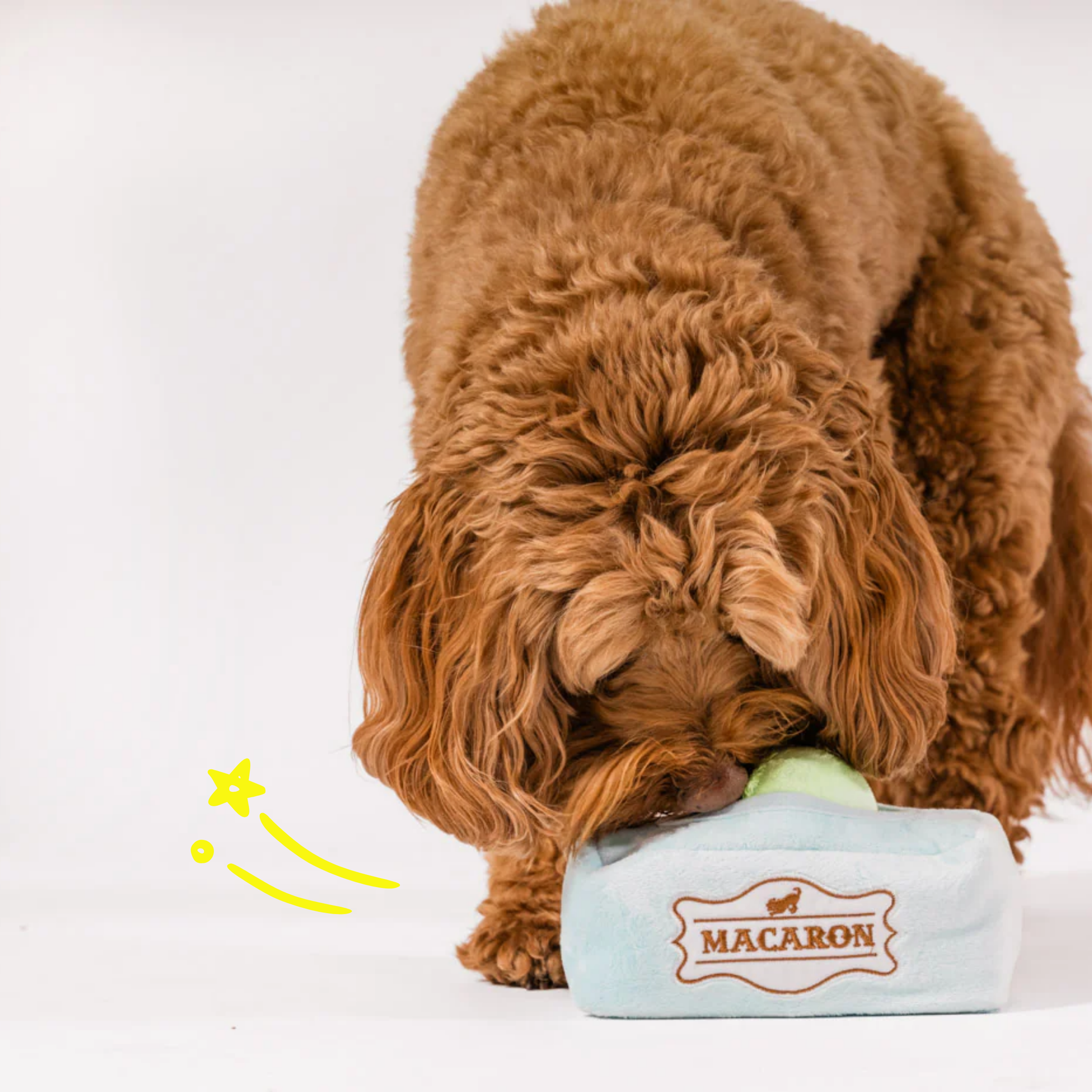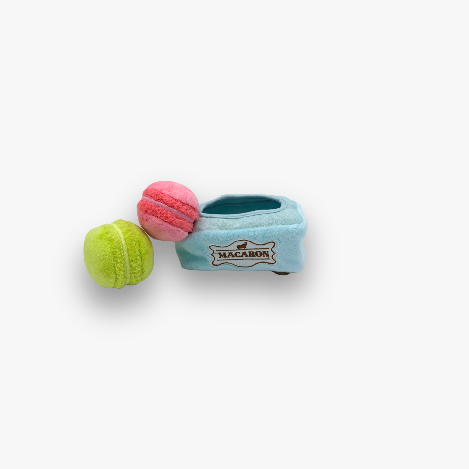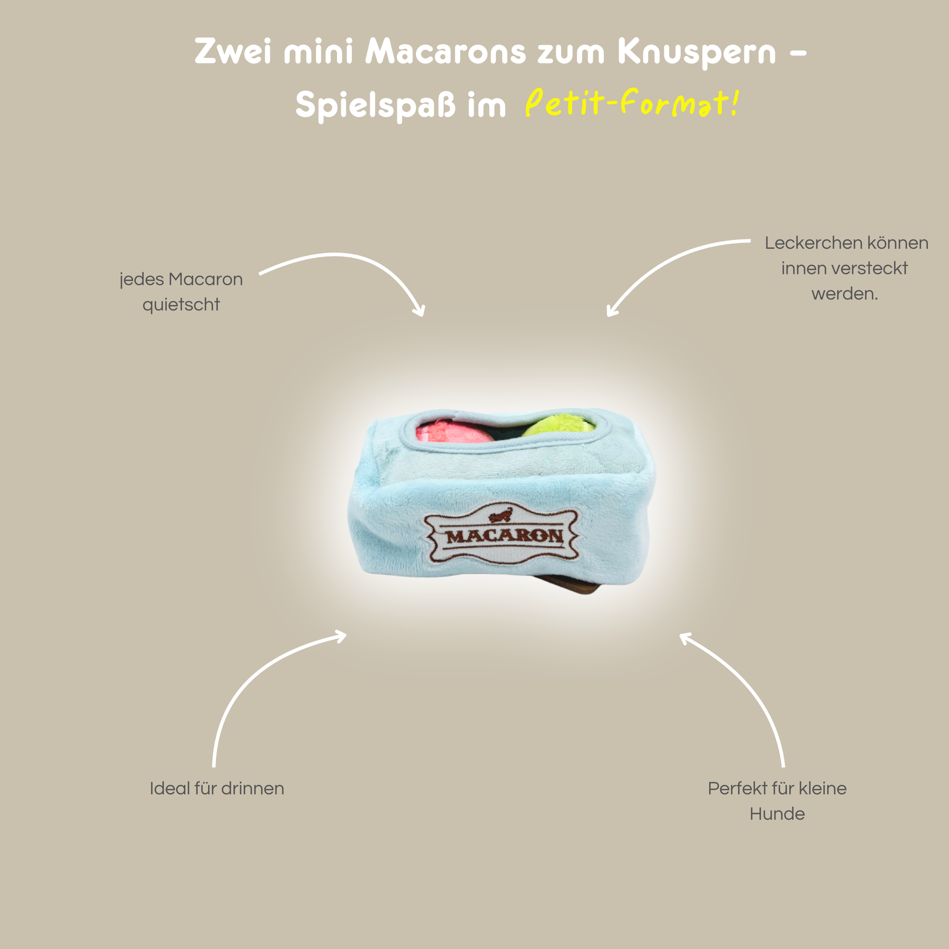 Die Mini Macarons sind das perfekte Häppchen für kleine Hunde mit großem Spielhunger. Flauschig, verspielt und mit Überraschungseffekt: Knisterfolie und ein versteckter Quietscher machen jeden Biss zum Genuss – ganz ohne Zucker!