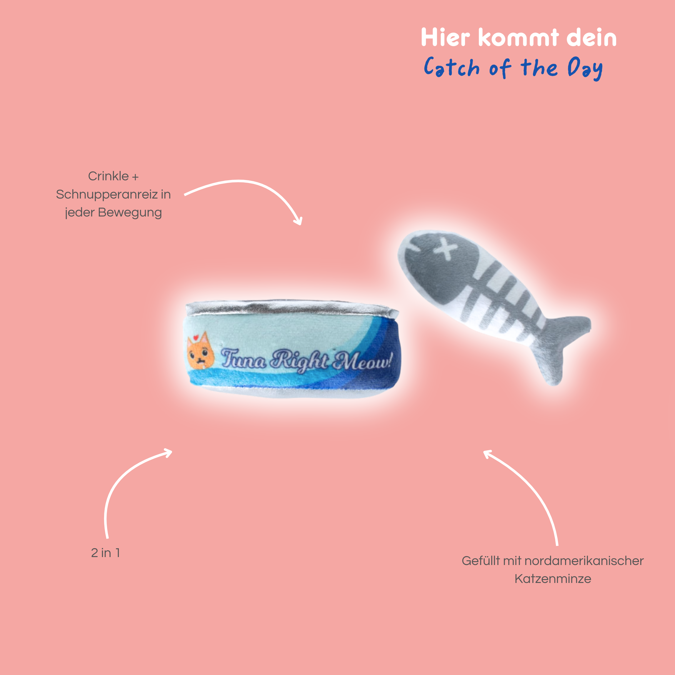 Dieses zuckersüße 2‑teilige Set besteht aus einer Mini‑Thunfischdose und einem Fischskelett – beide kuschelweich, mit Crinkle‑Papier-Knistern und echter Katzenminze gefüllt. Perfekt für Bounce, Bat, Chase & Play – und natürlich ein echter Hingucker im Katzenparadies.