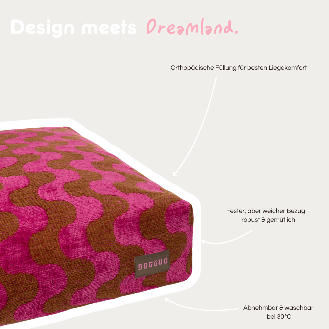 Das WAVEY Hundebett sieht aus wie frisch aus einem Design-Magazin – und fühlt sich für deinen Hund genauso gut an. Innen sorgt die orthopädische Füllung aus Memory-Flocken für perfekten Druckausgleich und erholsamen Schlaf.